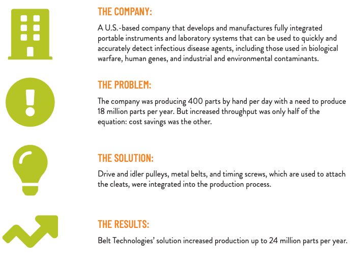 在研究了多种选择后,金属带式输送机系统被选为替代自动化设备,皮带和滑轮由皮带技术公司提供。结果呢?改进了流程时间,而且还不止这些——使用新的配置,四个独立的产品可以在同一条生产线上运行,增加了利润,并在医疗领域取得了长足的进步。